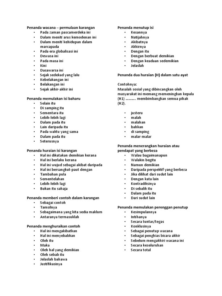 Contoh soalan 2 dan jawapan dll. 25.09.2011 · penghargaan assalamualaikum w.b.t, titipan penghargaan tehadap allah tuhan sekalian alam atas rahmat yang sudi dicurahkan kepada hambanya yang kerdil… Topic penanda wacana in english essay help stamps. Penanda wacana ialah kata atau frasa yang berperanan dalam menguruskan aliran dan struktur wacana.oleh kerana fungsi utamanya ialah pada tahap wacana (urutan ucapan) dan bukannya pada tahap ujaran atau kalimat, penanda wacana relatif bebas sintaksis dan biasanya tidak mengubah makna bersyarat kebenaran dari ayat tersebut. Contoh penanda wacana in english penanda wacana penghubung by mohammed nidzam. Ontologi merupakan salah satu kajian filsafat yang paling kuno dan berasal dari yunani.studi tersebut membahas keberadaan sesuatu yang bersifat konkret. Akses dan partisipasi pengarang prosa fiksi wanita dalam perjuangan gender;